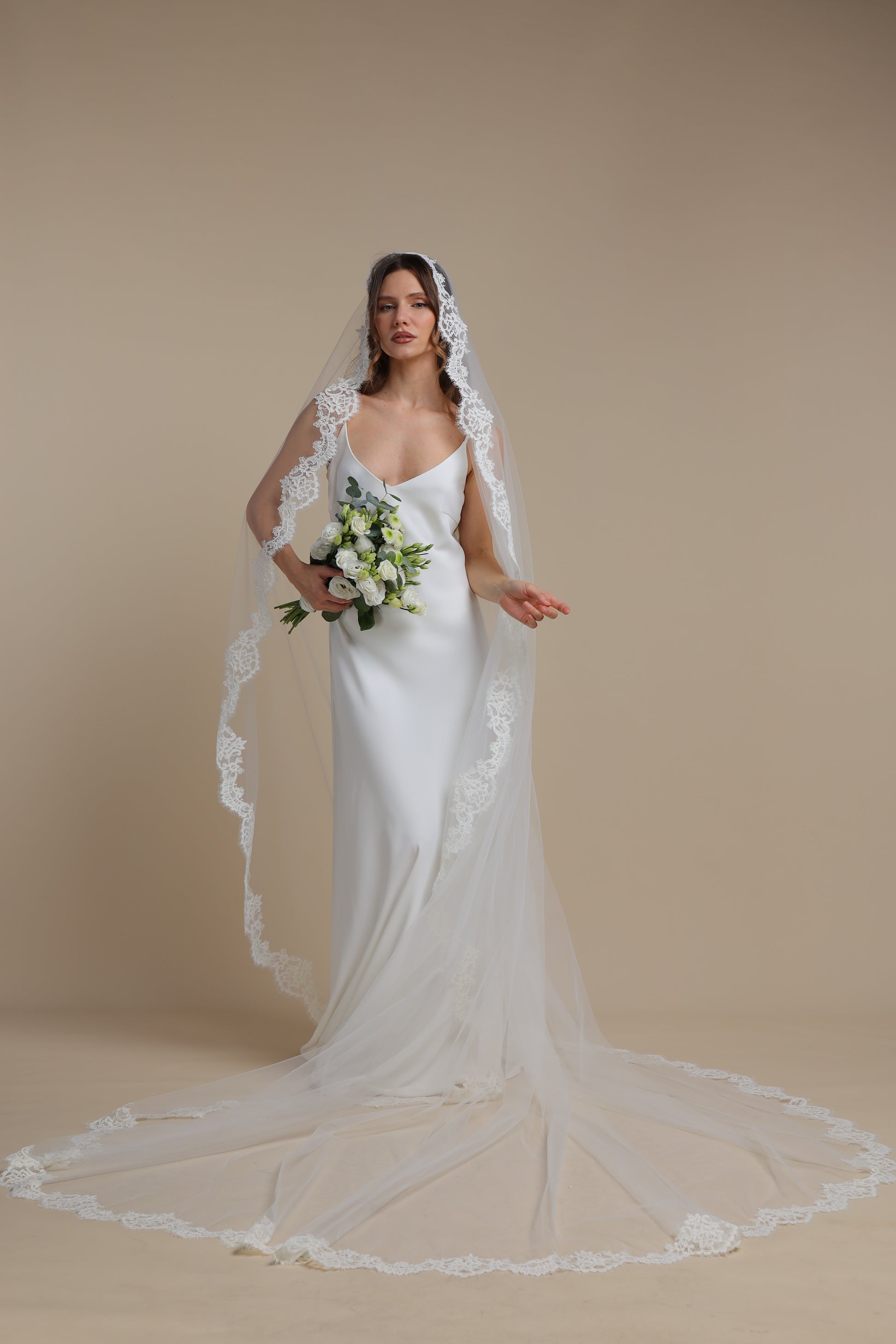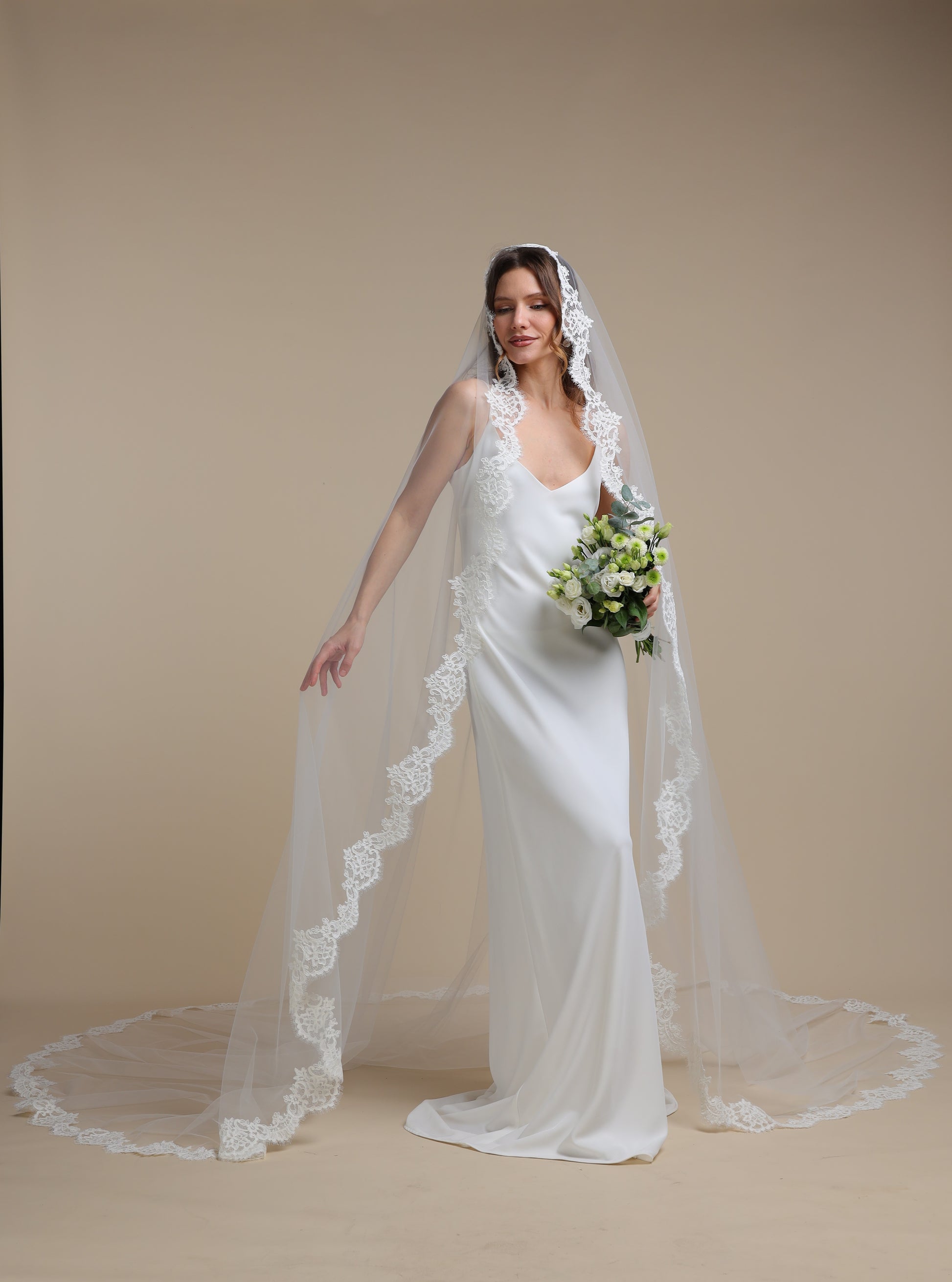 Long One Tier Mantilla Veil with Lace Scalloped Edge | Cathedral Lace Veil | Elegant Spanish Style Bridal Veil,M1094