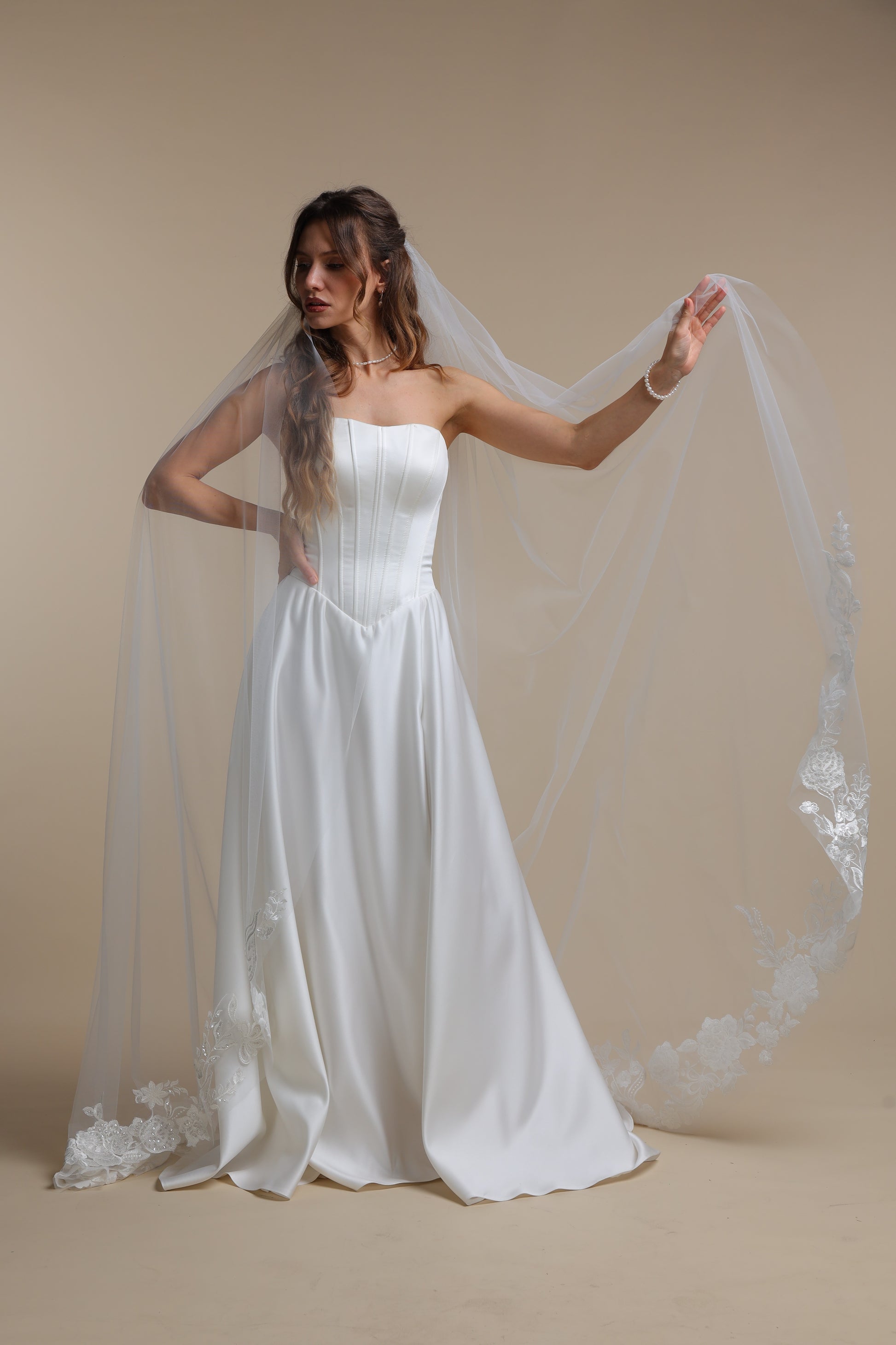 Ethereal Long Bridal Veil with Floral Lace Appliques — One Tier Cathedral Veil with Flower Train,M1091