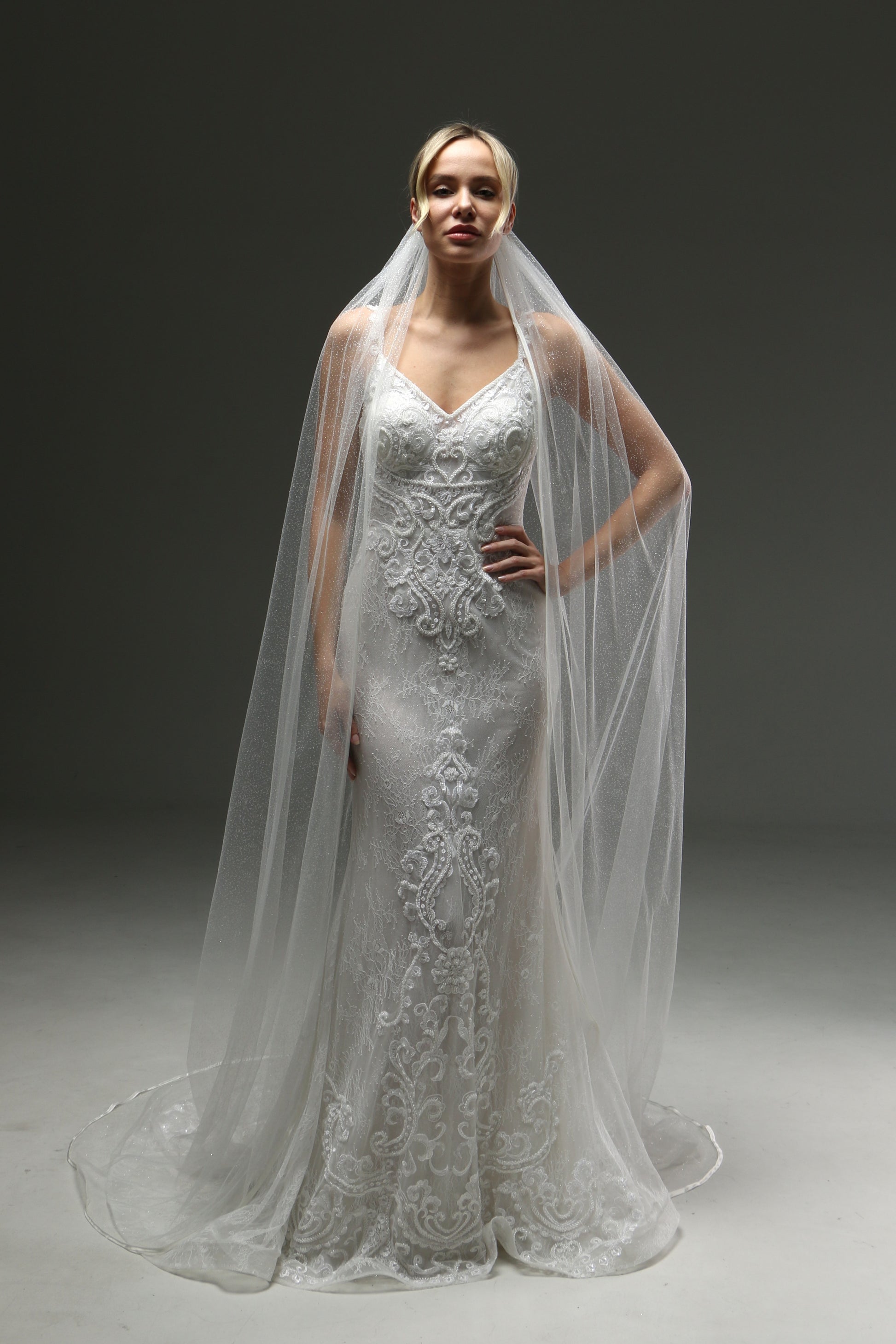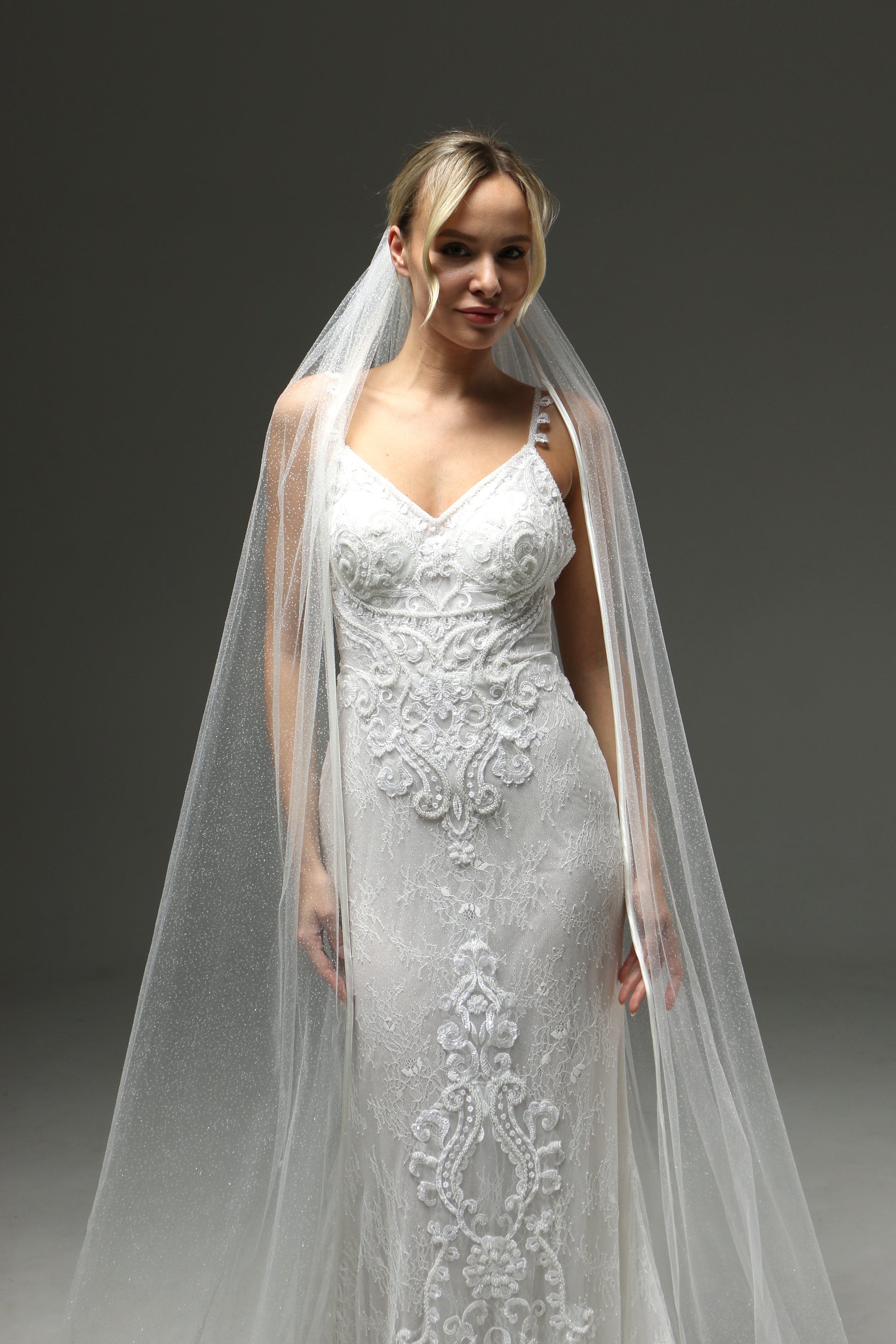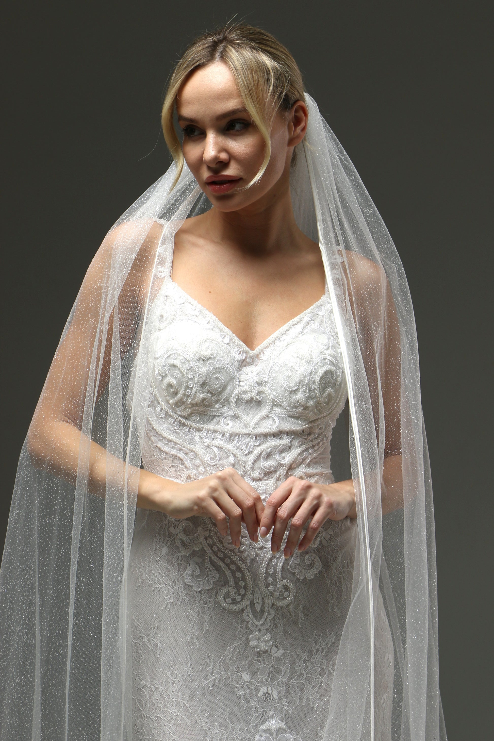 Cathedral Veil Soft Shine - One Layer Wedding Veil with Satin Edge, Sparkly Tulle Veil, Fingertip or Chapel Length - M1016