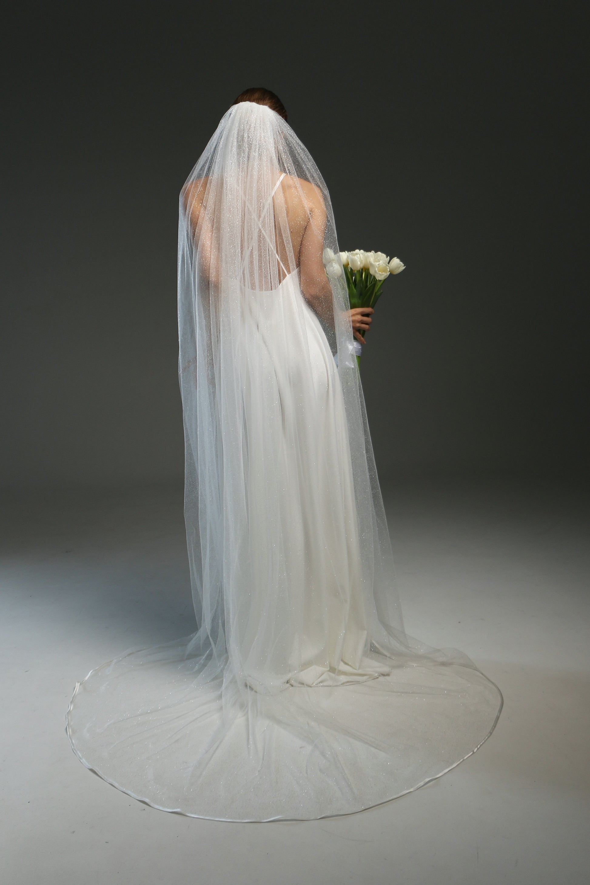Elegant Long Satin Edge Wedding Veil with Glitter & Ribbon - Classic Chapel Bridal Veil - M1041