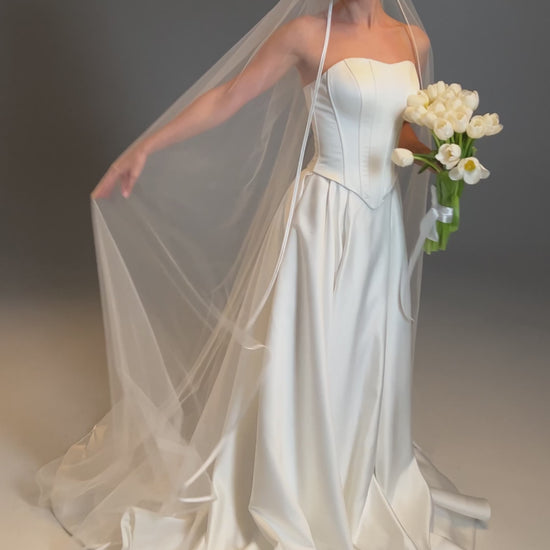 Elegant Satin Edge Wedding Veil - Long Fingertip Bridal Veil with Ribbon Trim | Classic Chapel Veil - M1048