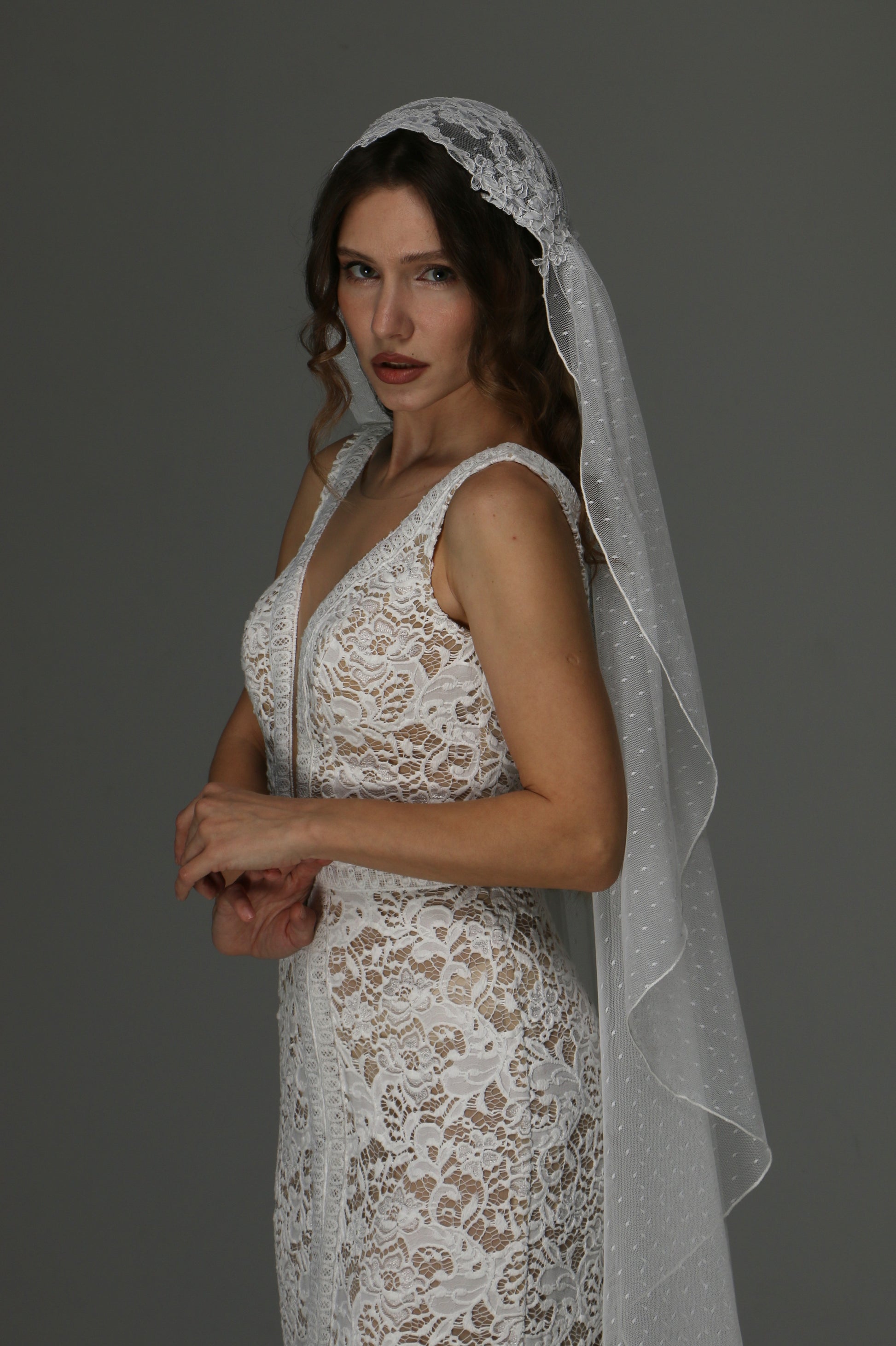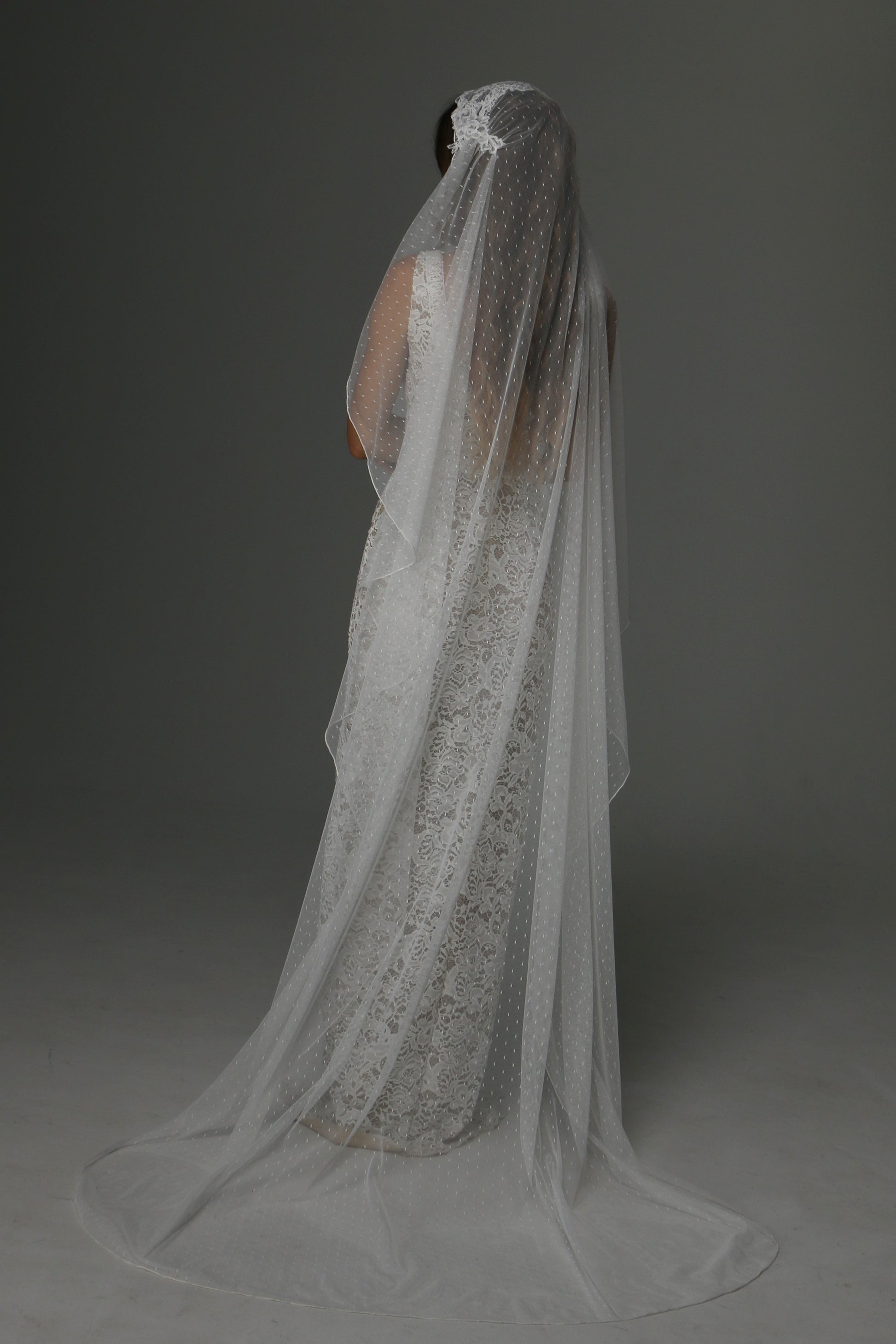 Juliet Cap Wedding Veil with Dotted Tulle and Lace Details – Boho One Tier Veil - M1070