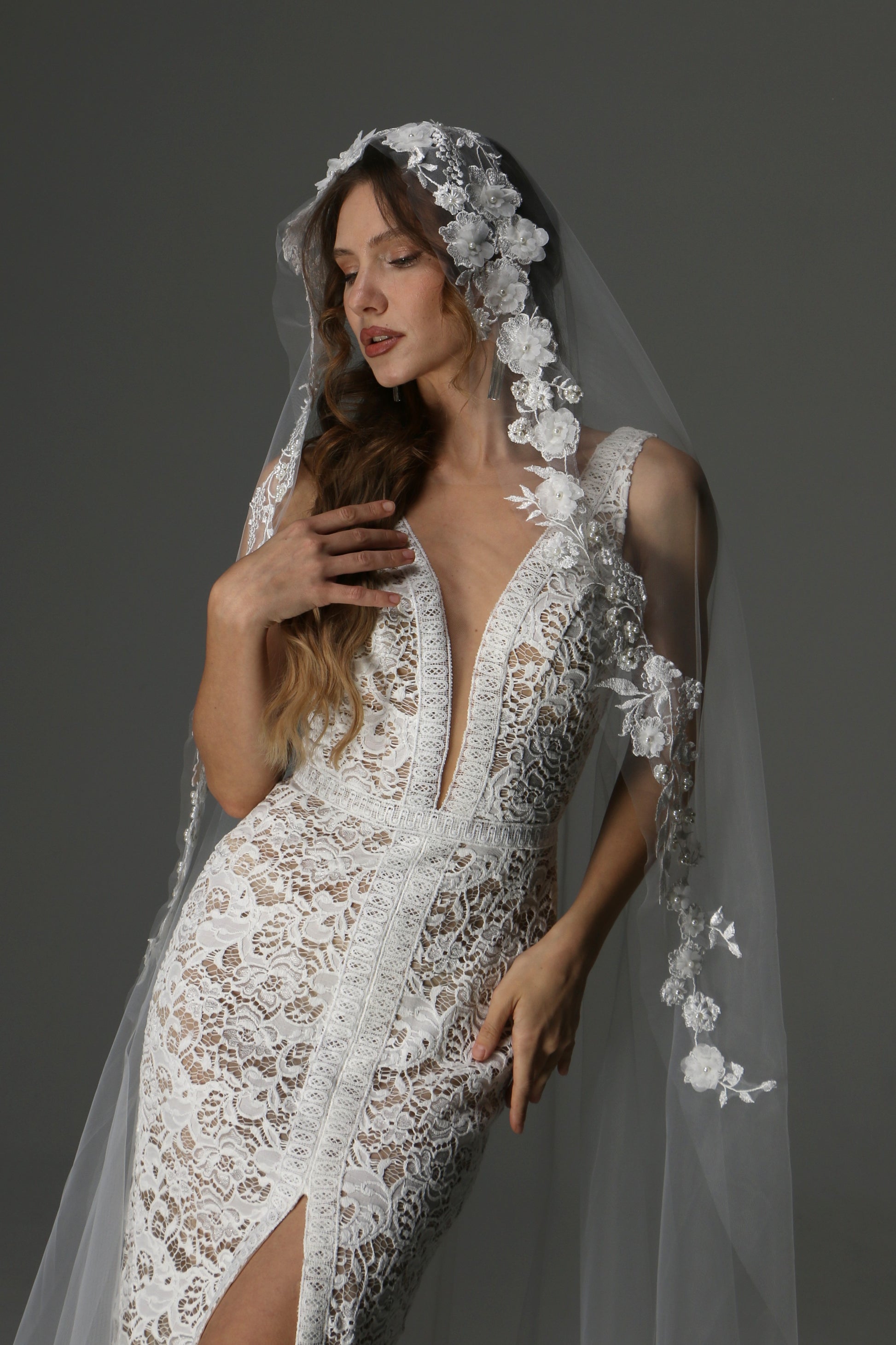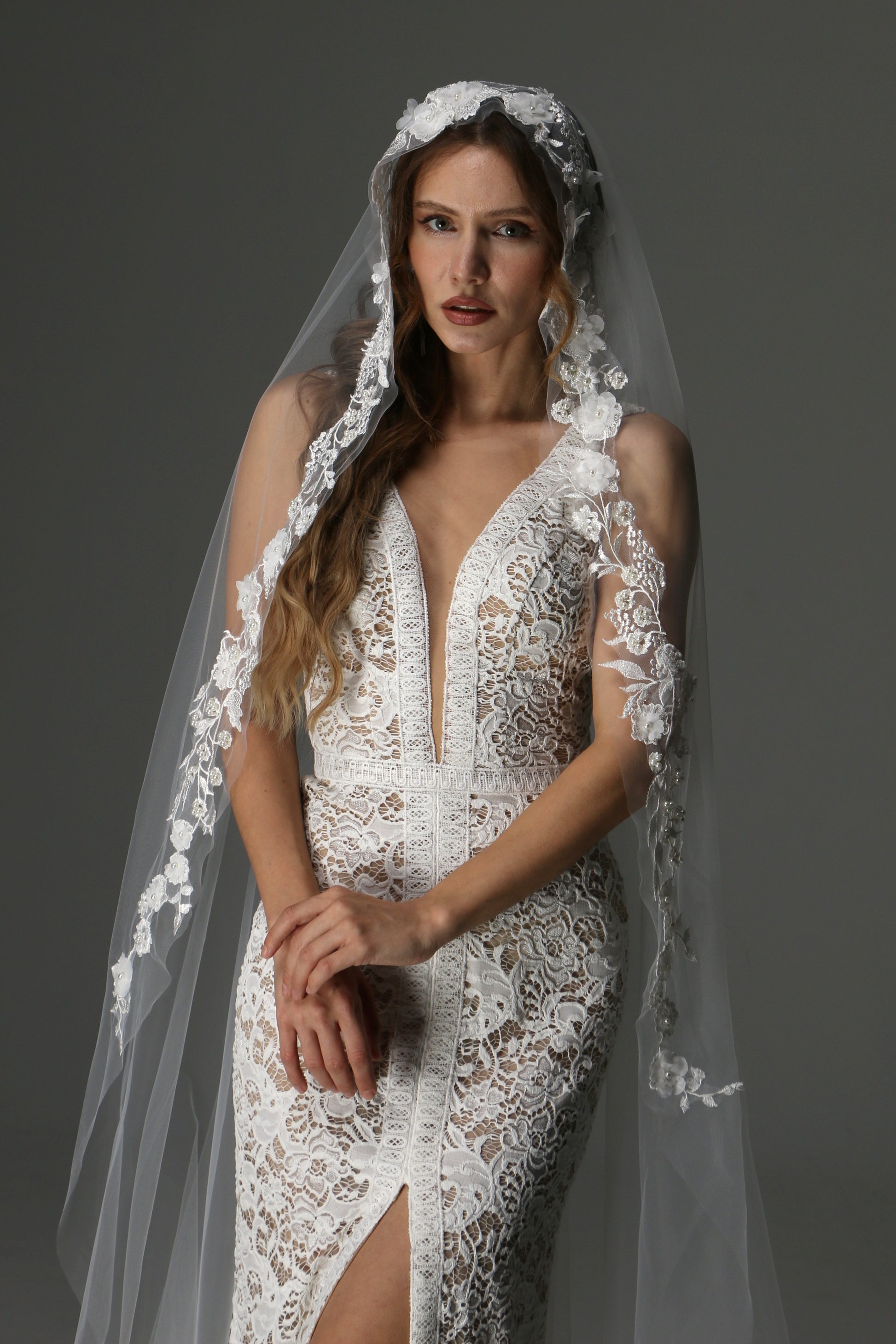 Modern Lace Appliqué Mantilla Veil – One Layer Boho Bridal Veil - M1073