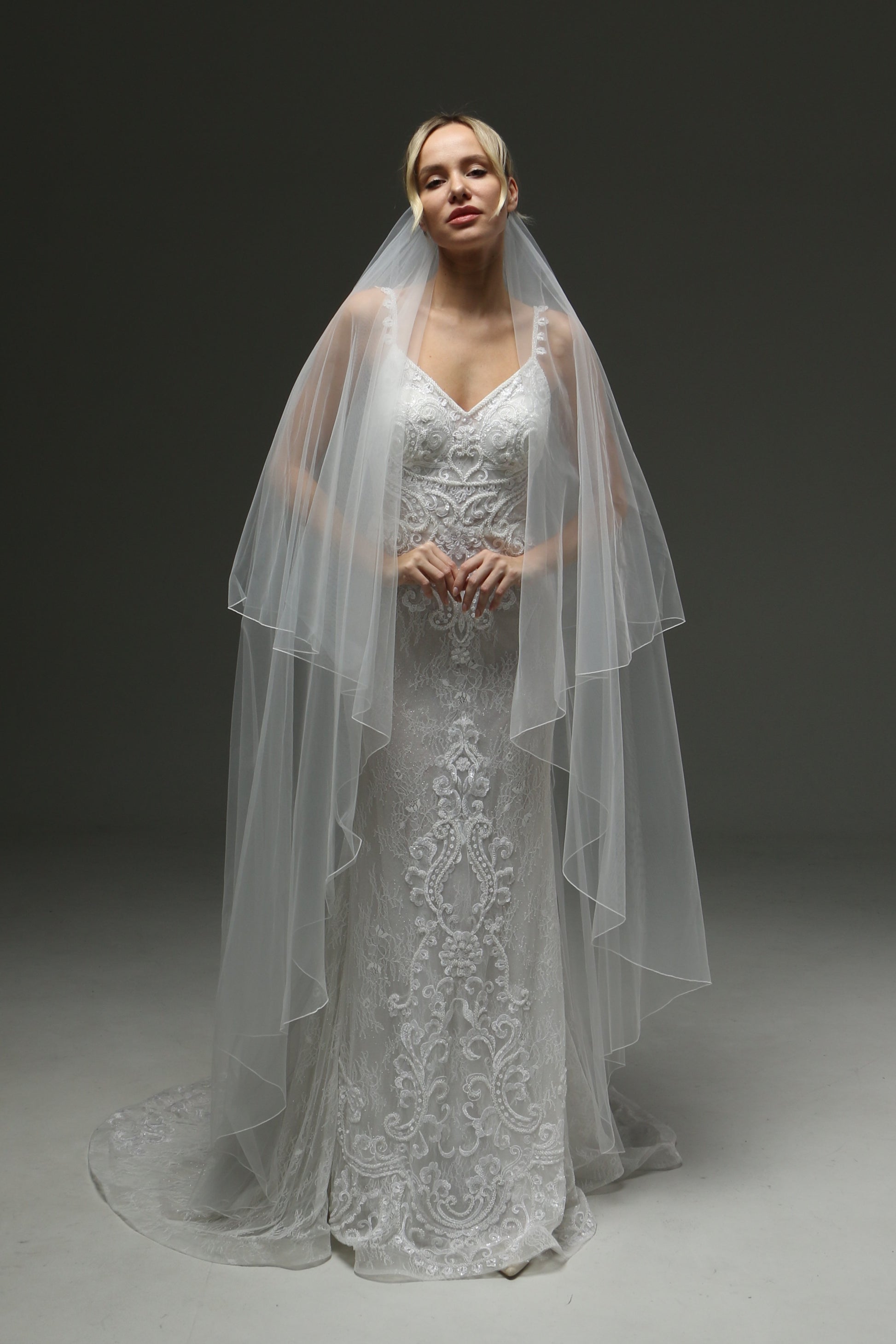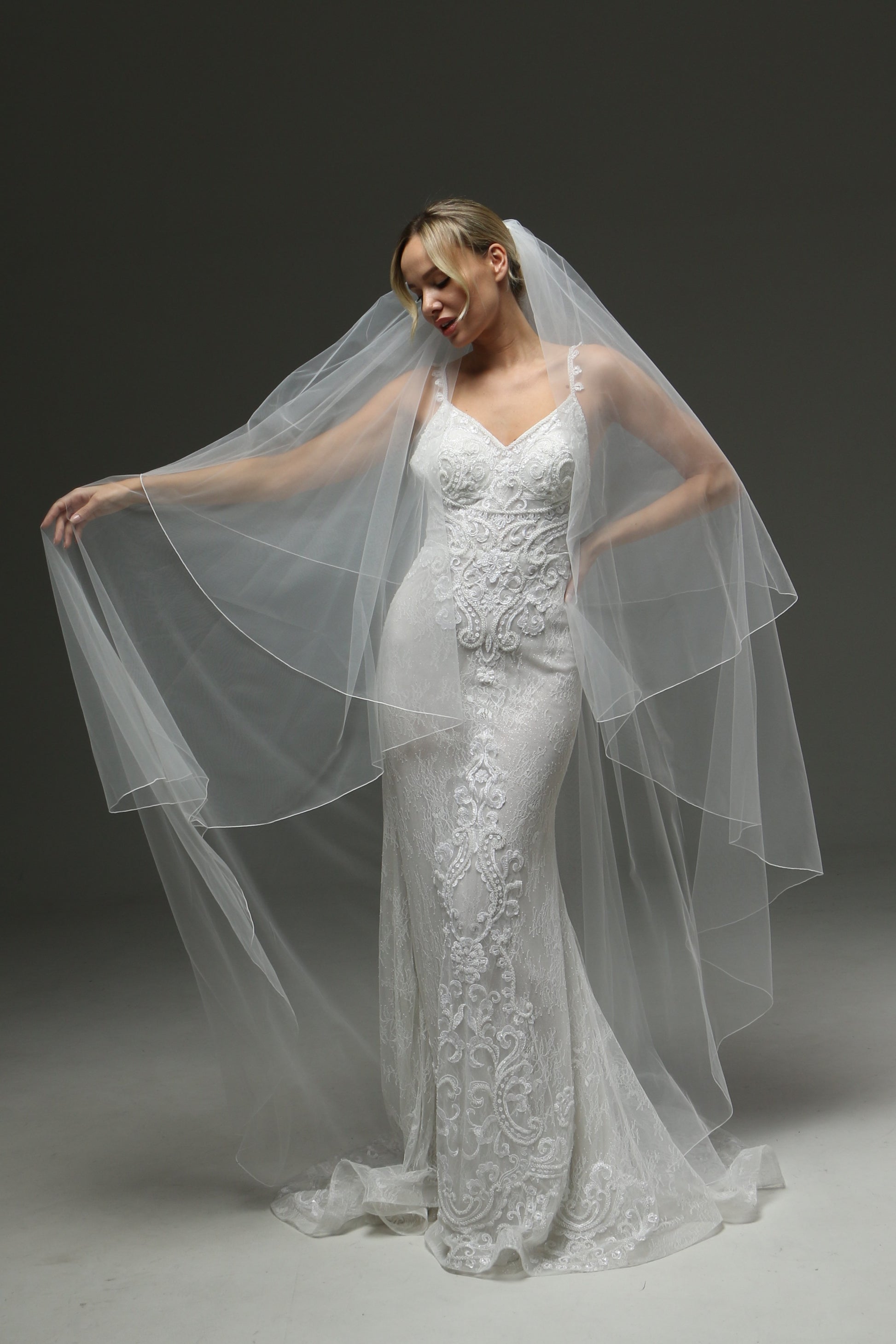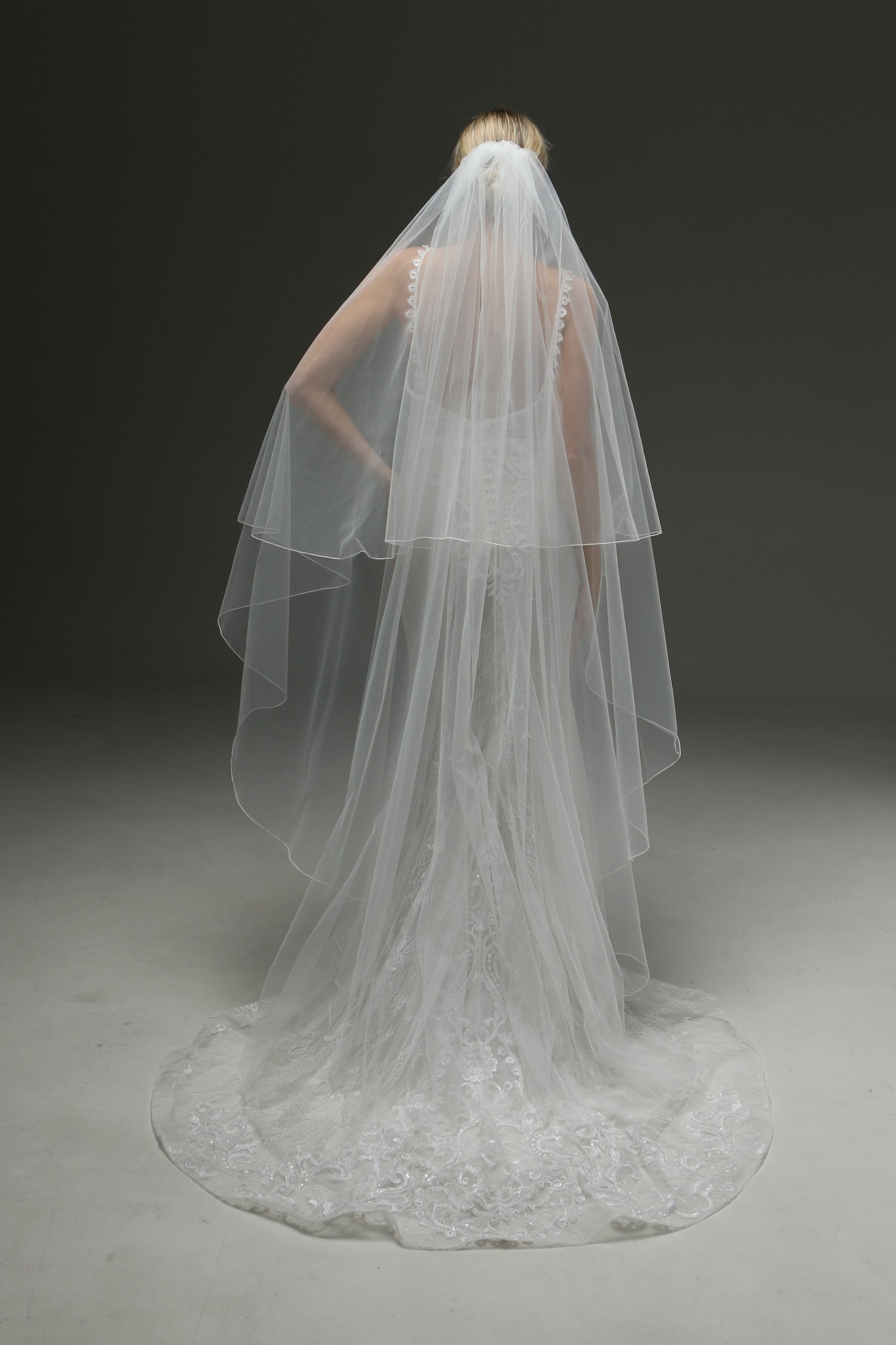 Sheer Wedding Veil With Pencil Edge - 2 Layers Blusher Veil, Cathedral Length, Statement Wedding Ve- M1017