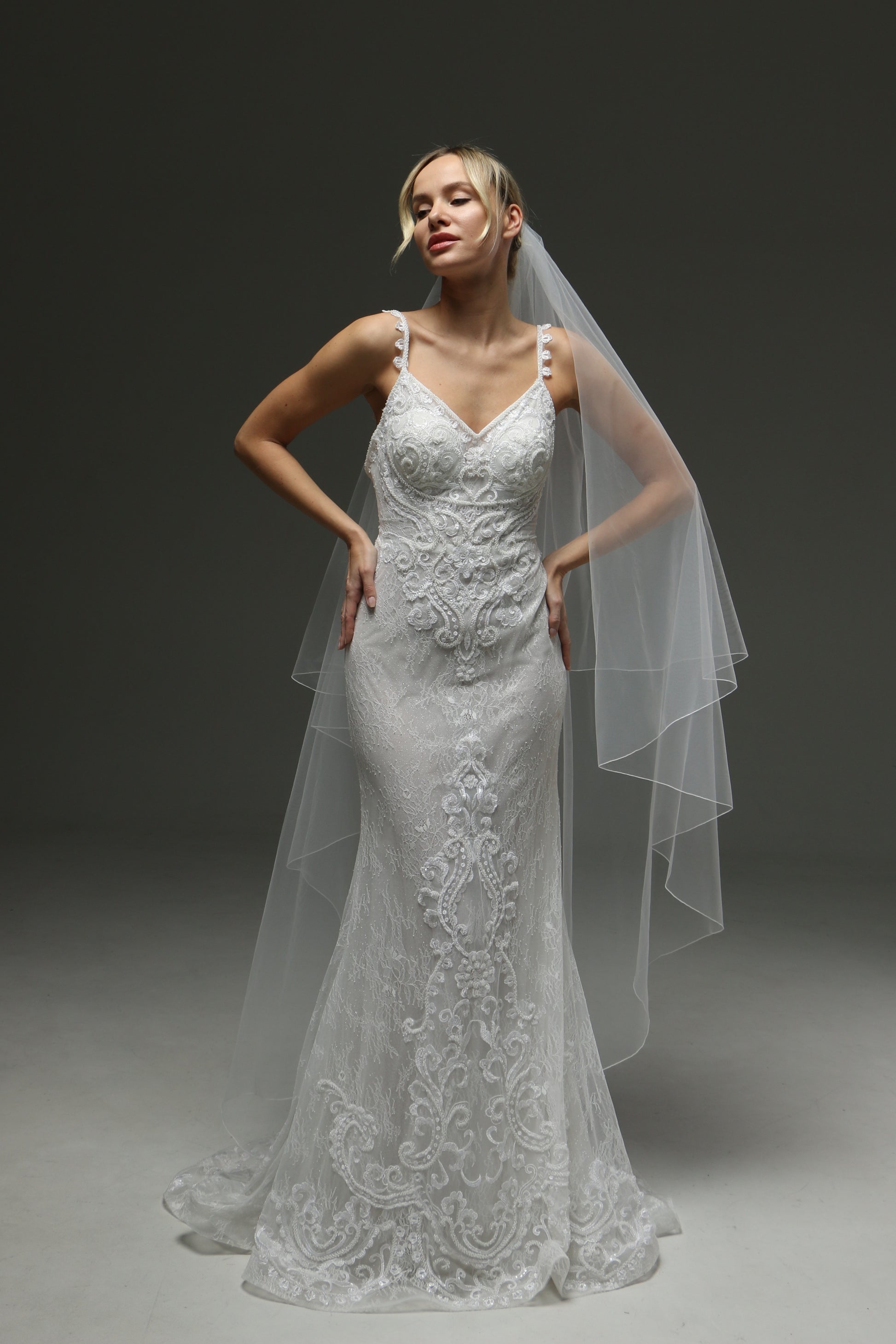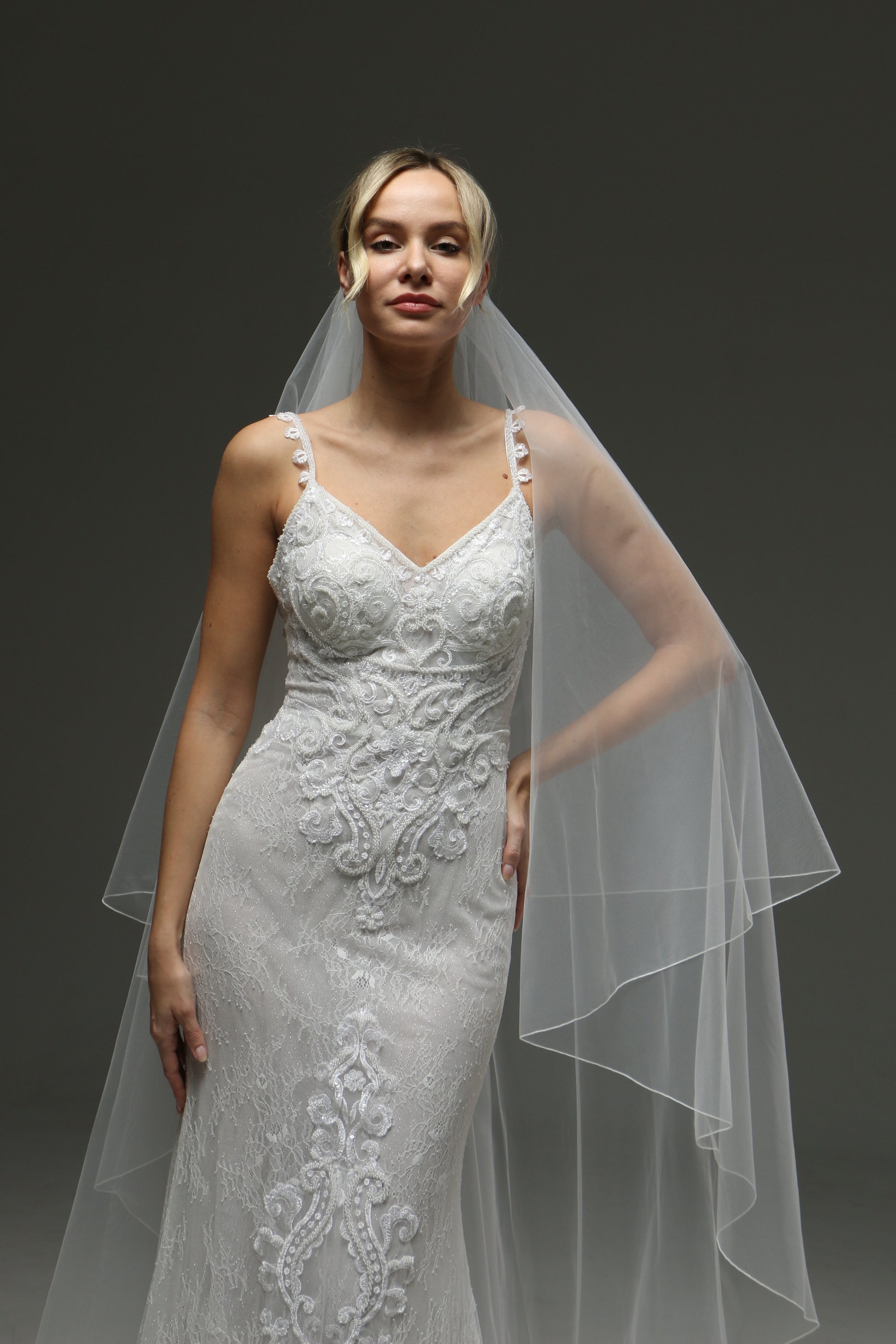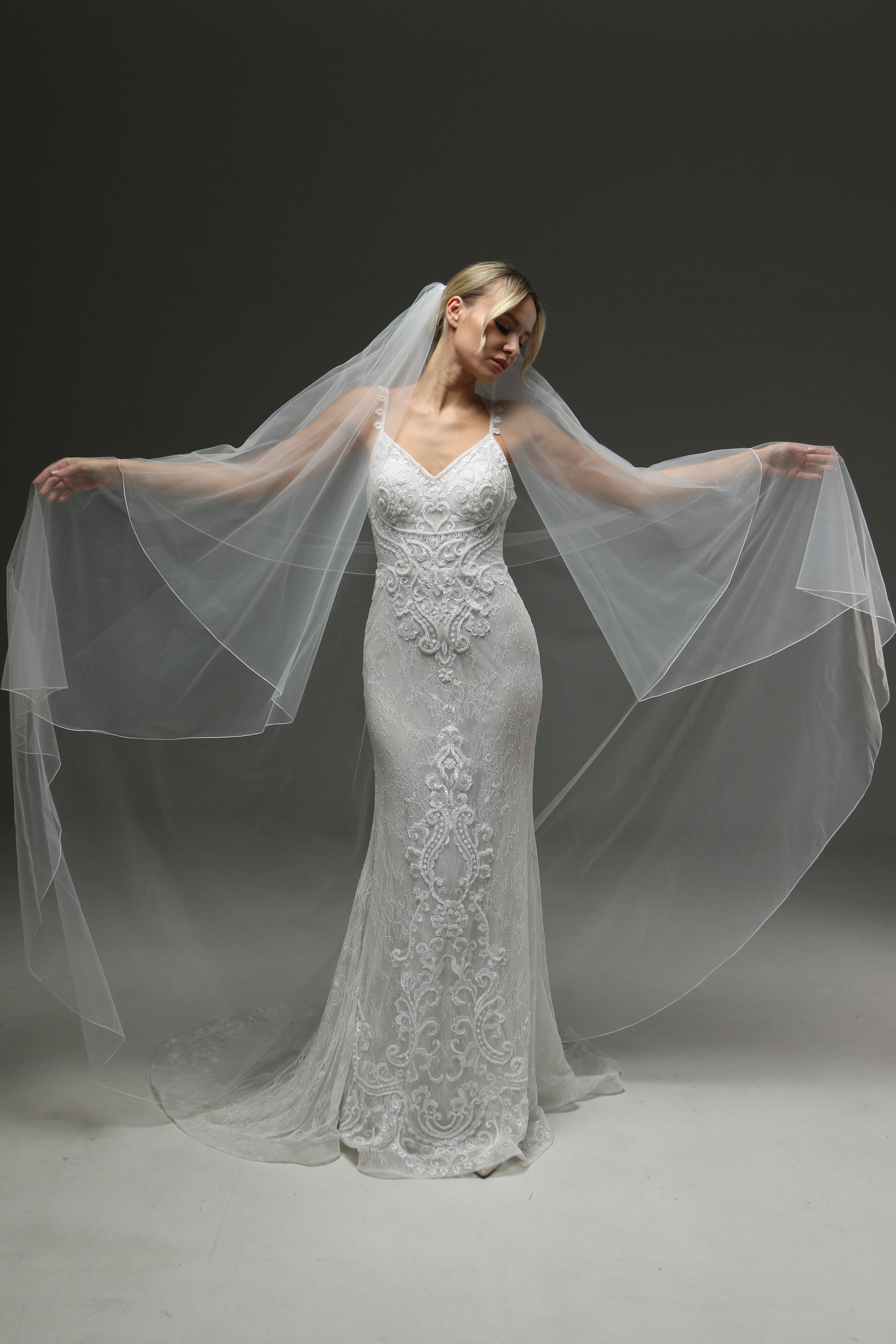 Sheer Wedding Veil With Pencil Edge - 2 Layers Blusher Veil, Cathedral Length, Statement Wedding Ve- M1017