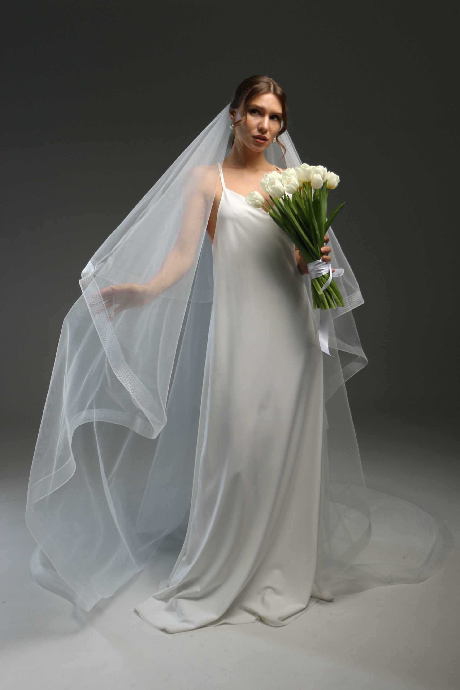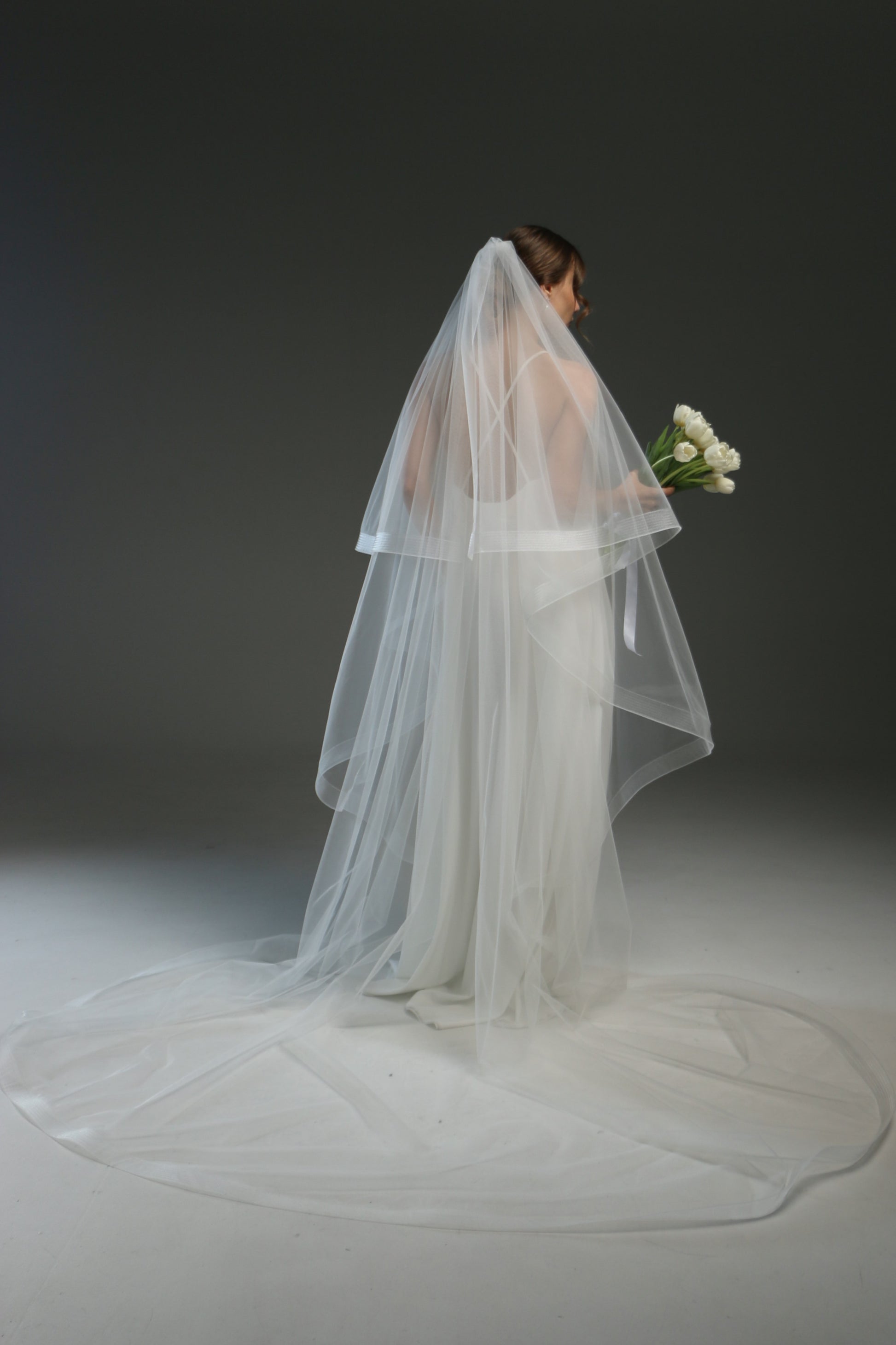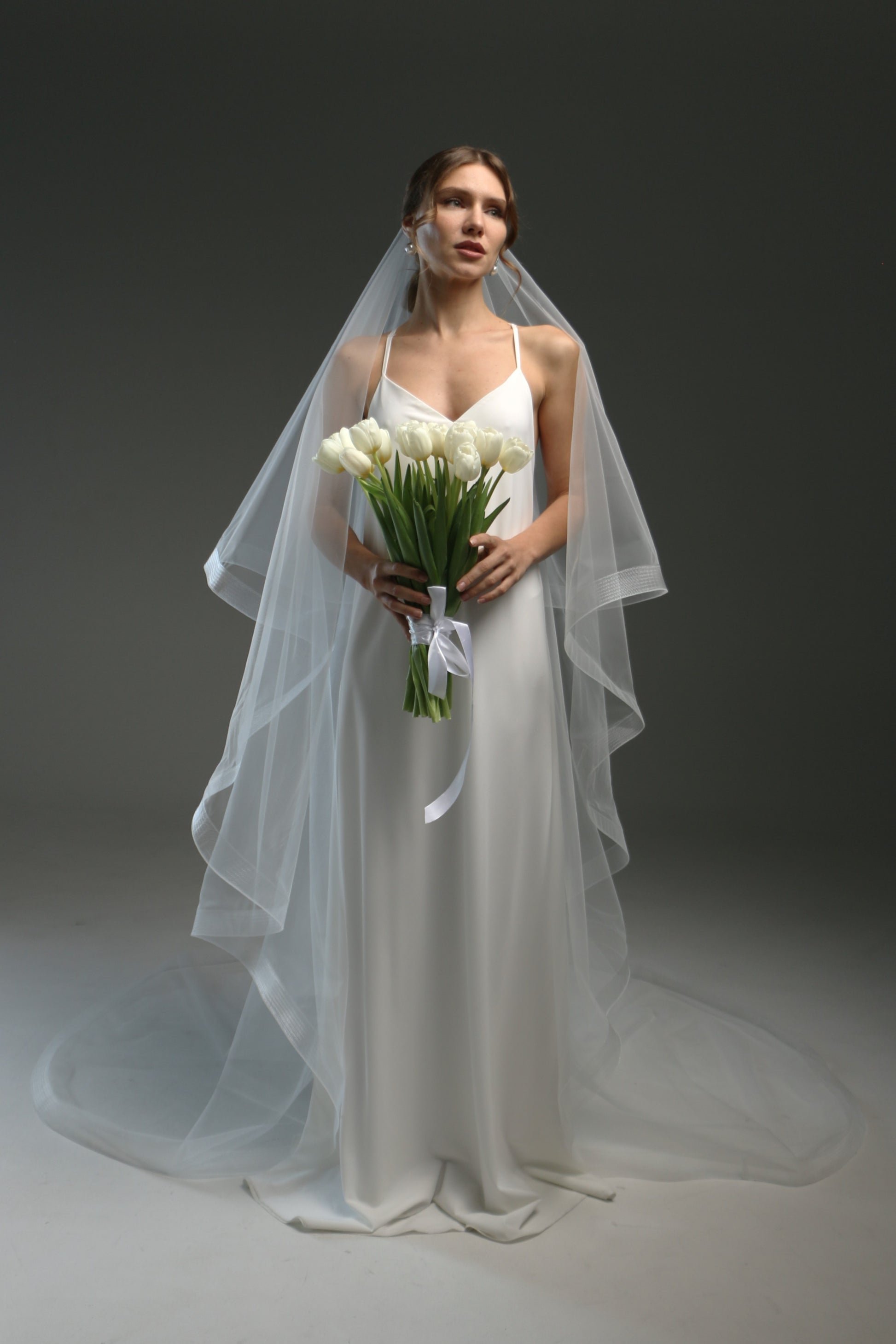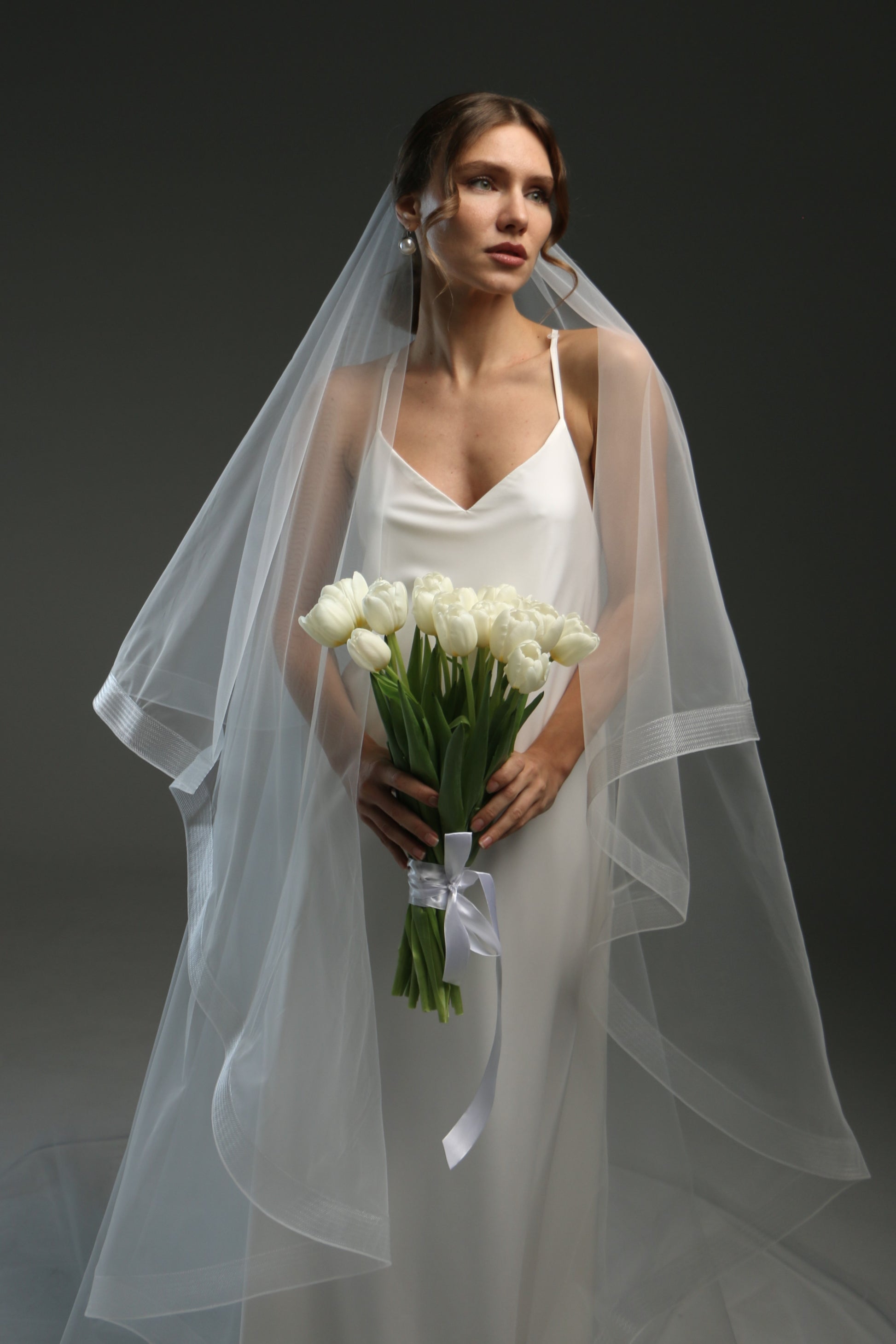 Veil with horsehair trim, Crinoline edge veil with blusher,Horsetail veil to your fingertips - M1038
